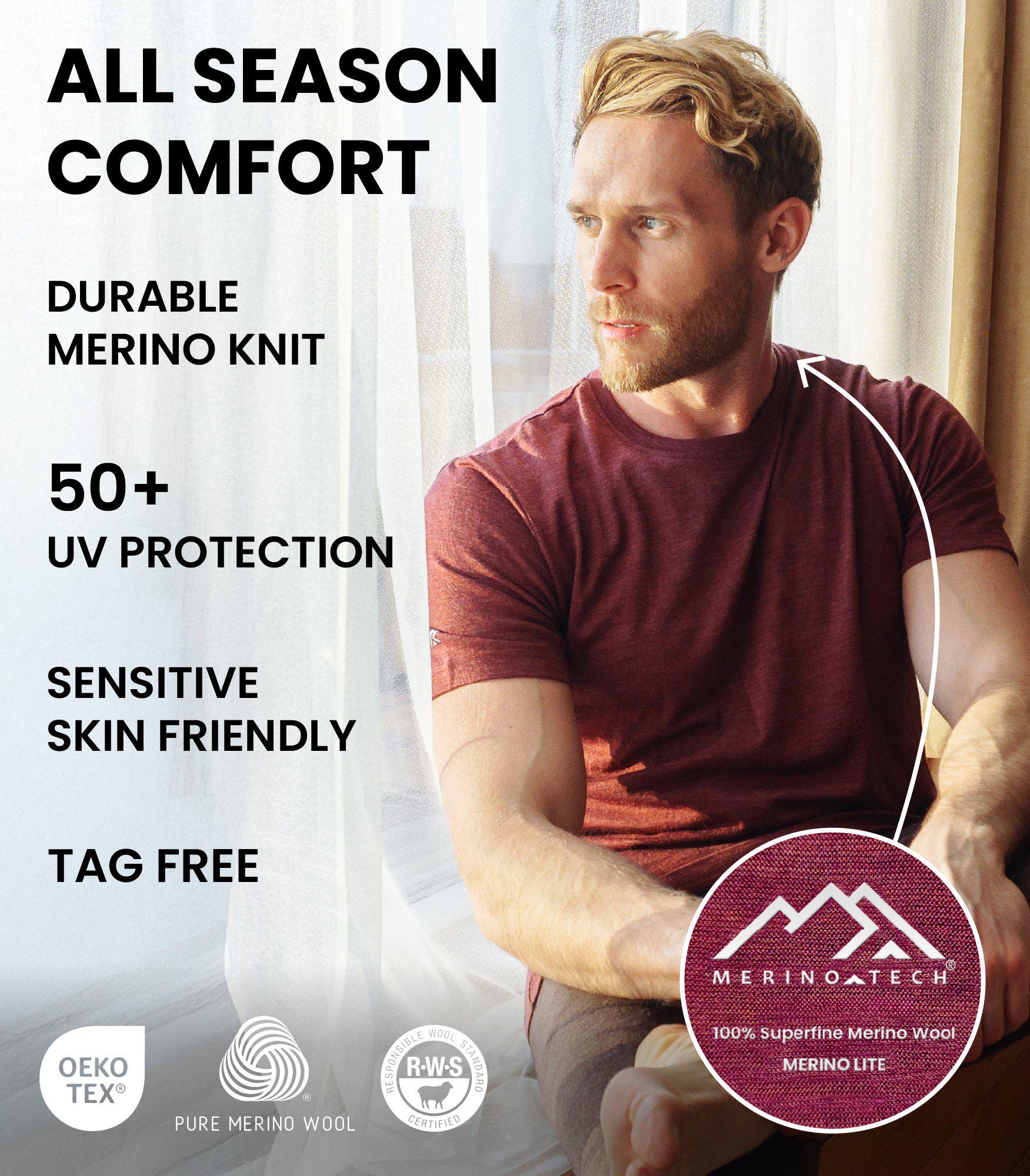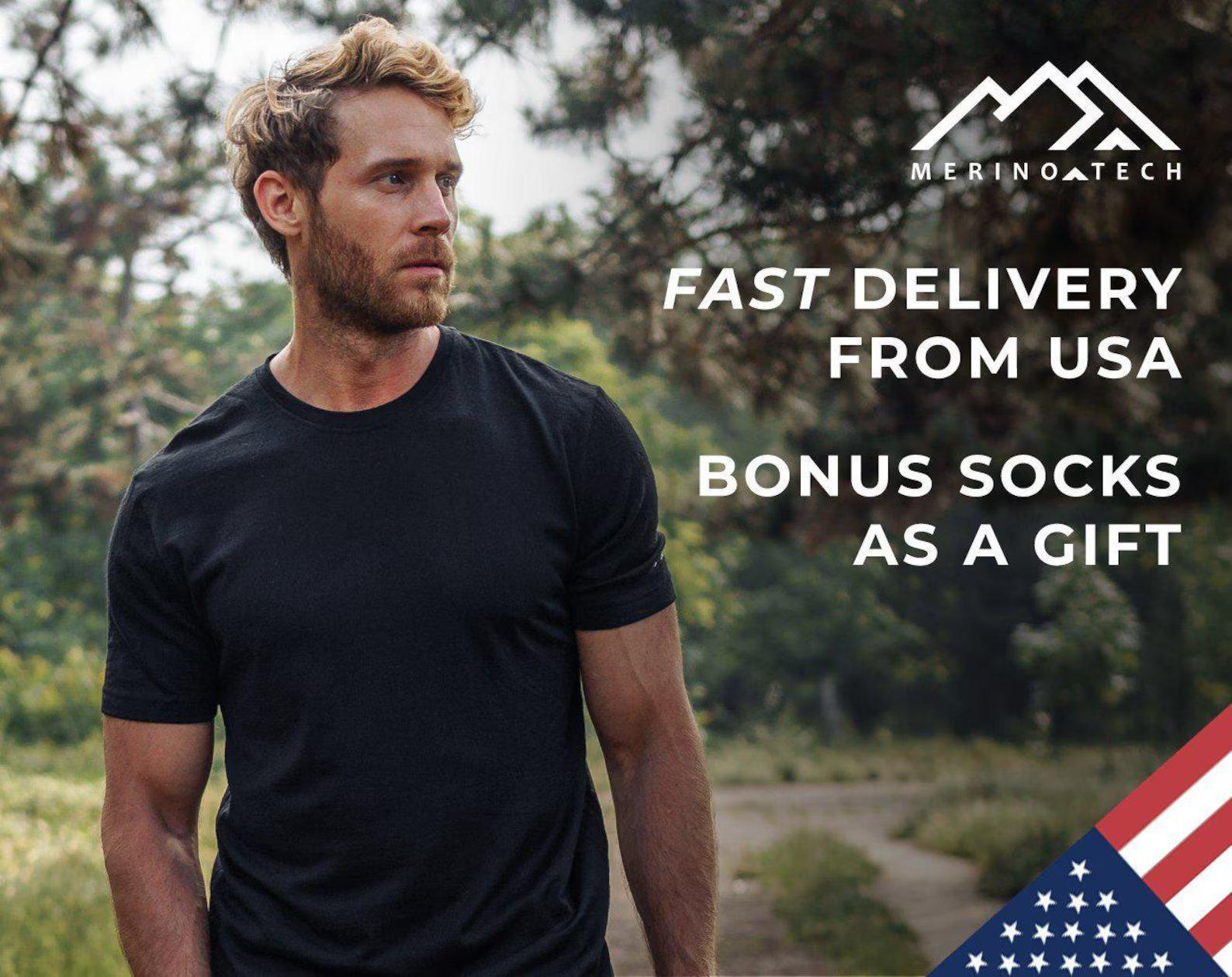 Package includes extremely lightweight base layer thermal t-shirt 165 g/m² + Merino wool hiking socks.
