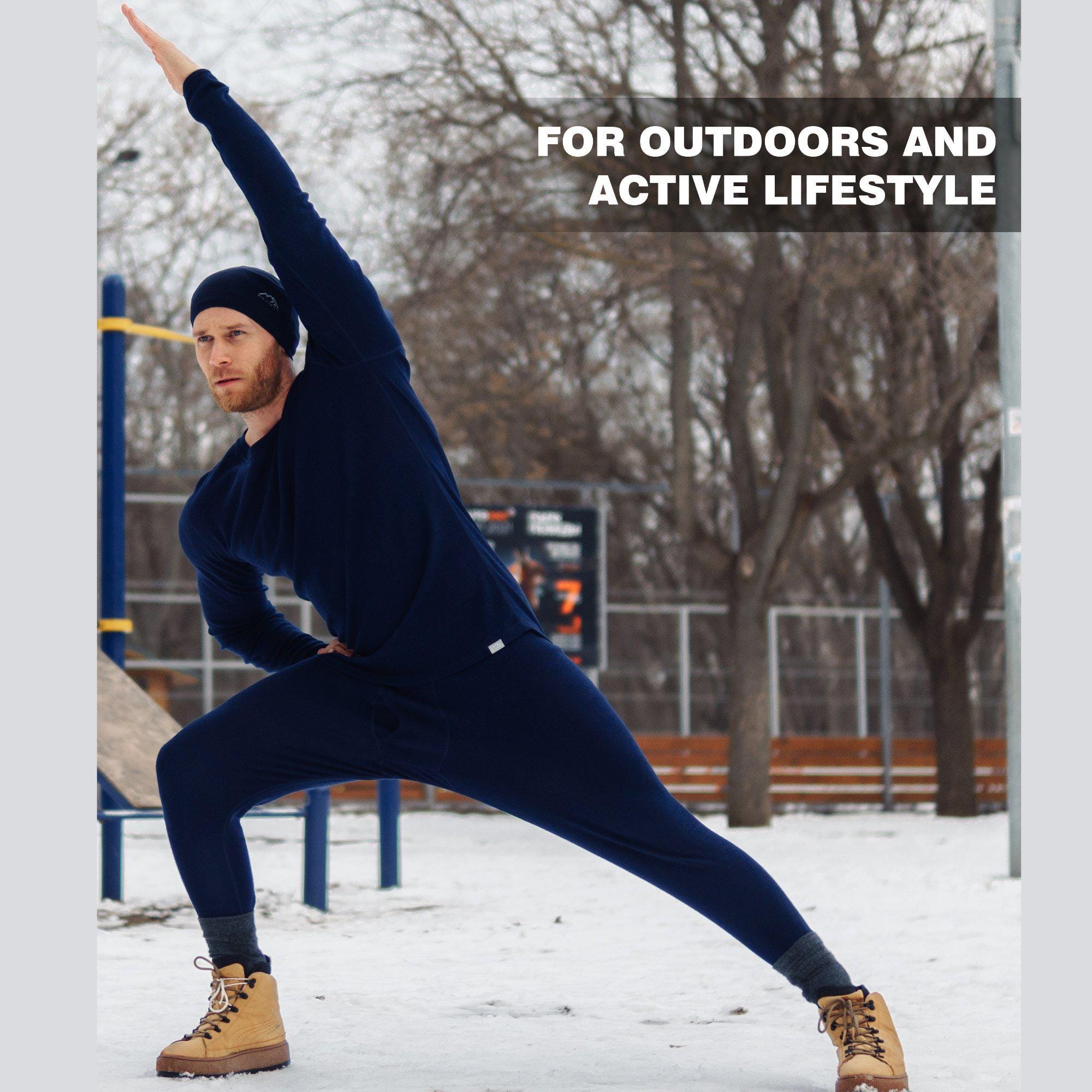 Stay warm and stylish with our Merino thermals wool sweatsuit, the ultimate mens running gear for winter adventures! Designed with 100% premium Merino wool, this thermal long sleeve shirt and leggings set offers unbeatable comfort, breathability, and insulation, making it perfect for outdoor sports, gym workouts, gymnastics, or everyday wear during chilly months.