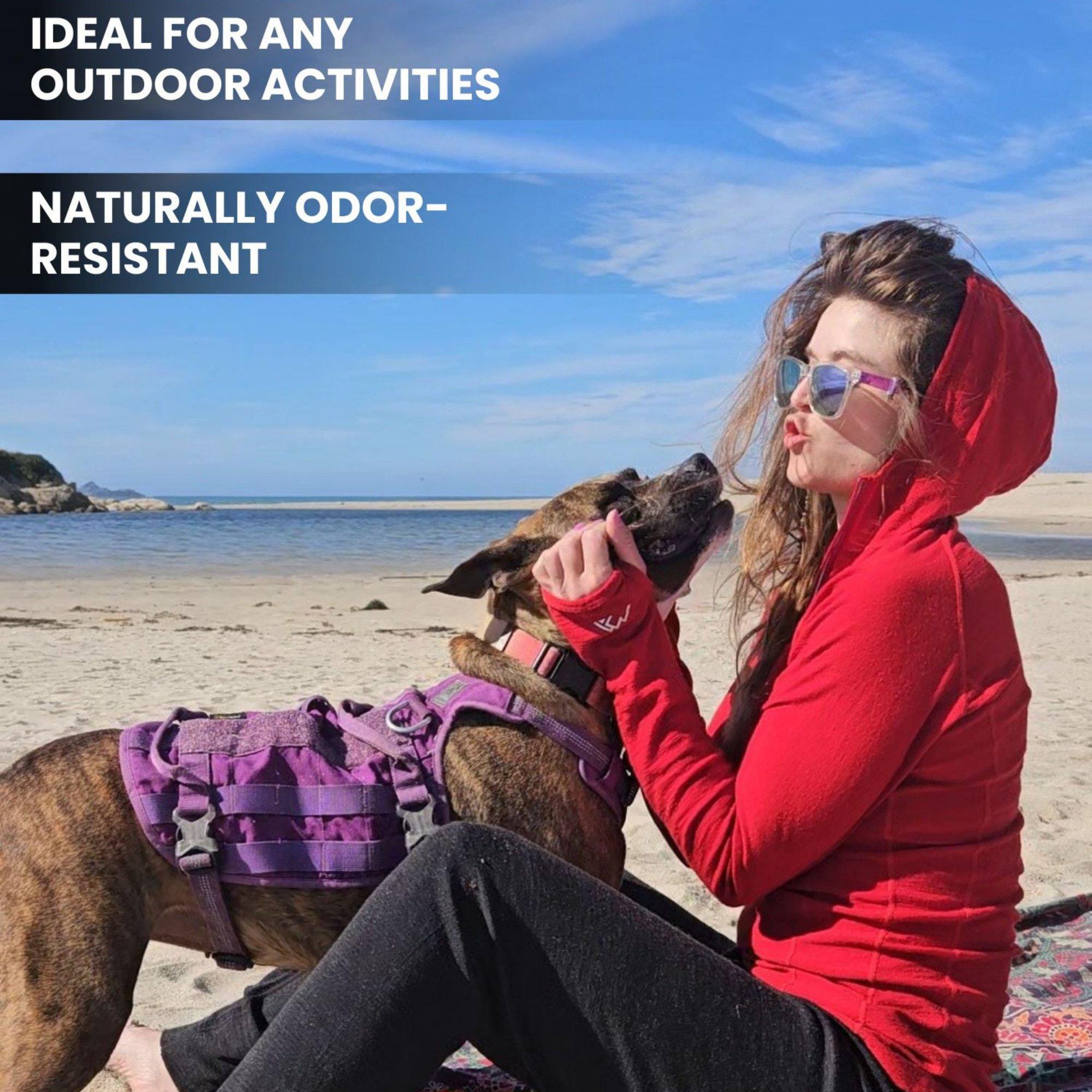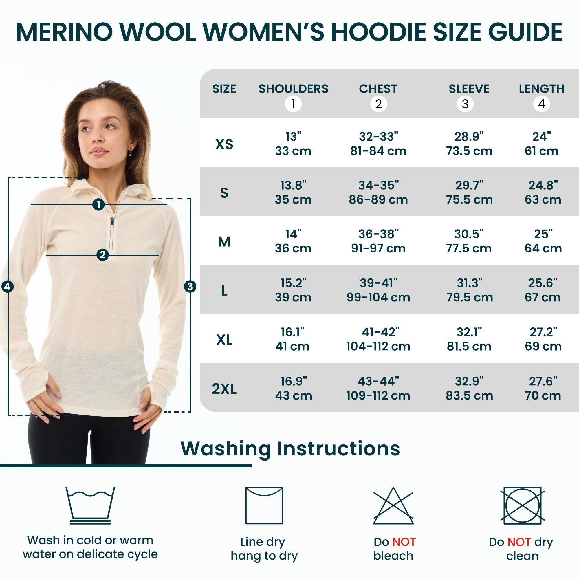 Merino wool, Lightweight 190 g/m² (grams per square meter) - 100% Superfine 19.5 Micron Zip Up Wool Hoodie for Women provides all day comfort and no itch! Designed for daily wear without rubbing, overheating, or bunching of regular cotton. The natural wicking and odor-resistant properties of Merino long sleeve top allow it to absorb moisture better than any other fabric, keeping you dry and fresh.