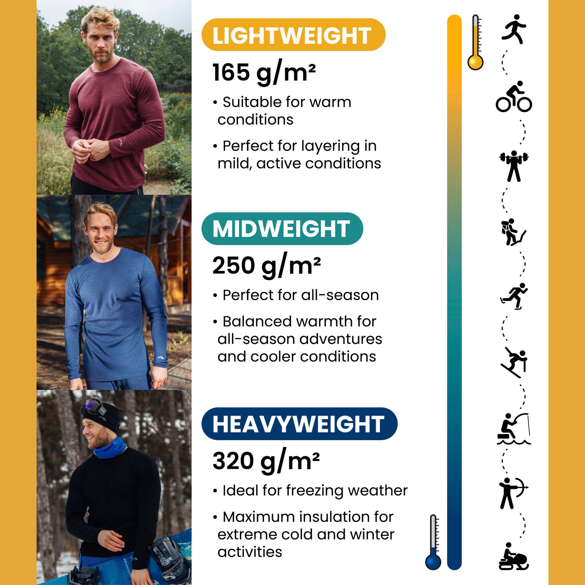 Merino wool, Lightweight 165 GSM (grams per square meter) - 100% superfine Merino fabric provides all day comfort and no itch. The natural wicking and odor-resistant properties of Merino organic leggings for men allow it to absorb moisture better than any other fabric, keeping you dry and fresh.