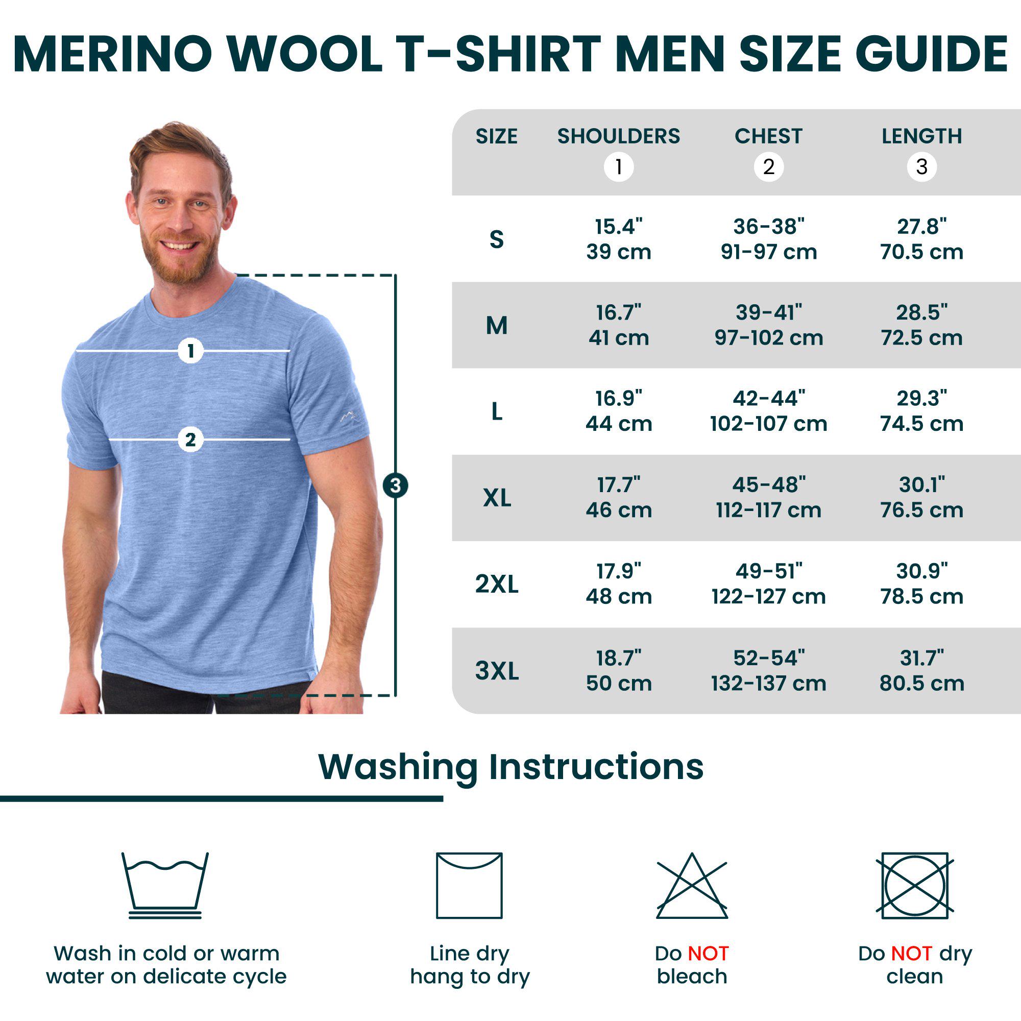 Merino wool, Lightweight 165 GSM (grams per square meter) - 100% superfine Merino fabric provides all day comfort and no itch. The natural wicking and odor-resistant properties of Merino men’s tee allow it to absorb moisture better than any other fabric, keeping you dry and fresh.