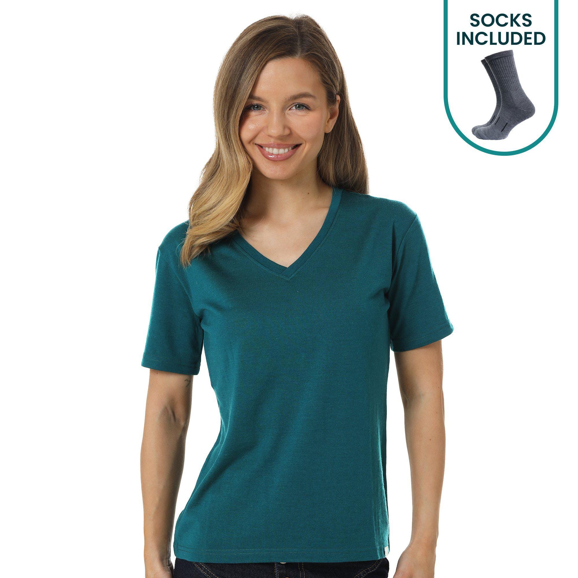 Package includes extremely lightweight base layer thermal t-shirt 165 g/m² + Merino wool hiking socks.
