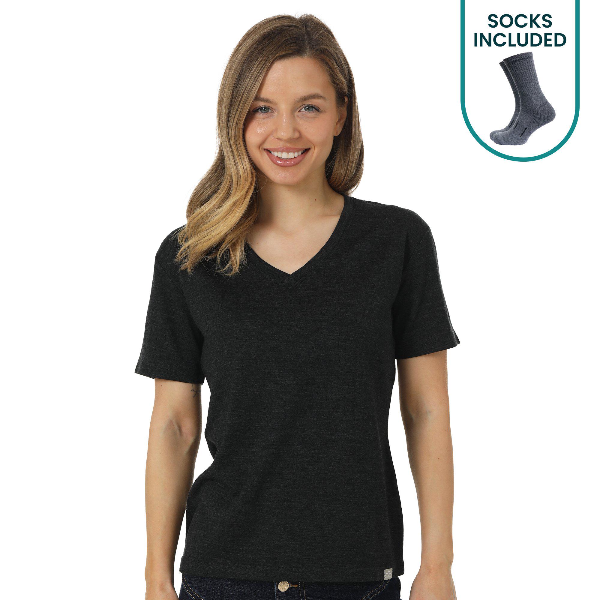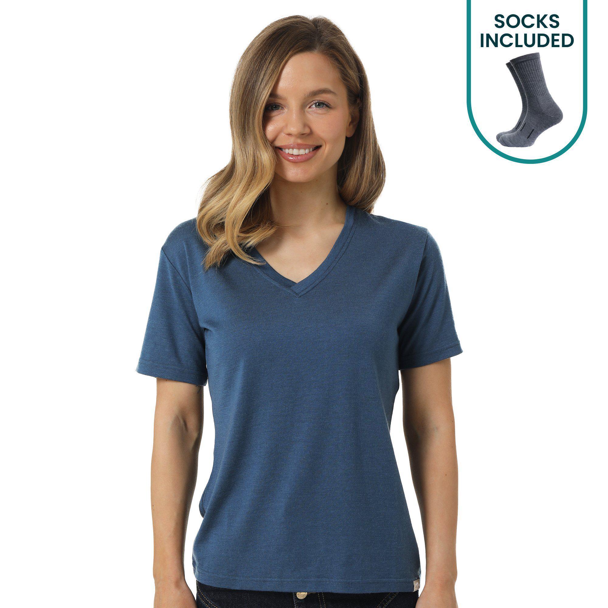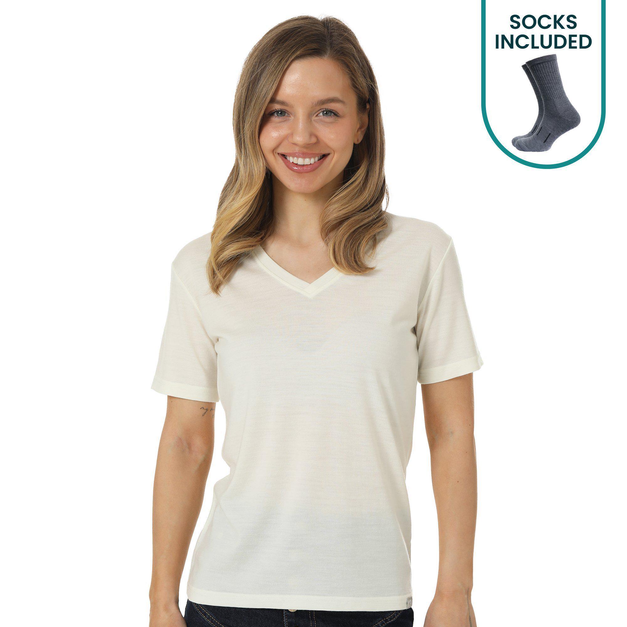 Package includes extremely lightweight base layer thermal t-shirt 165 g/m² + Merino wool hiking socks.