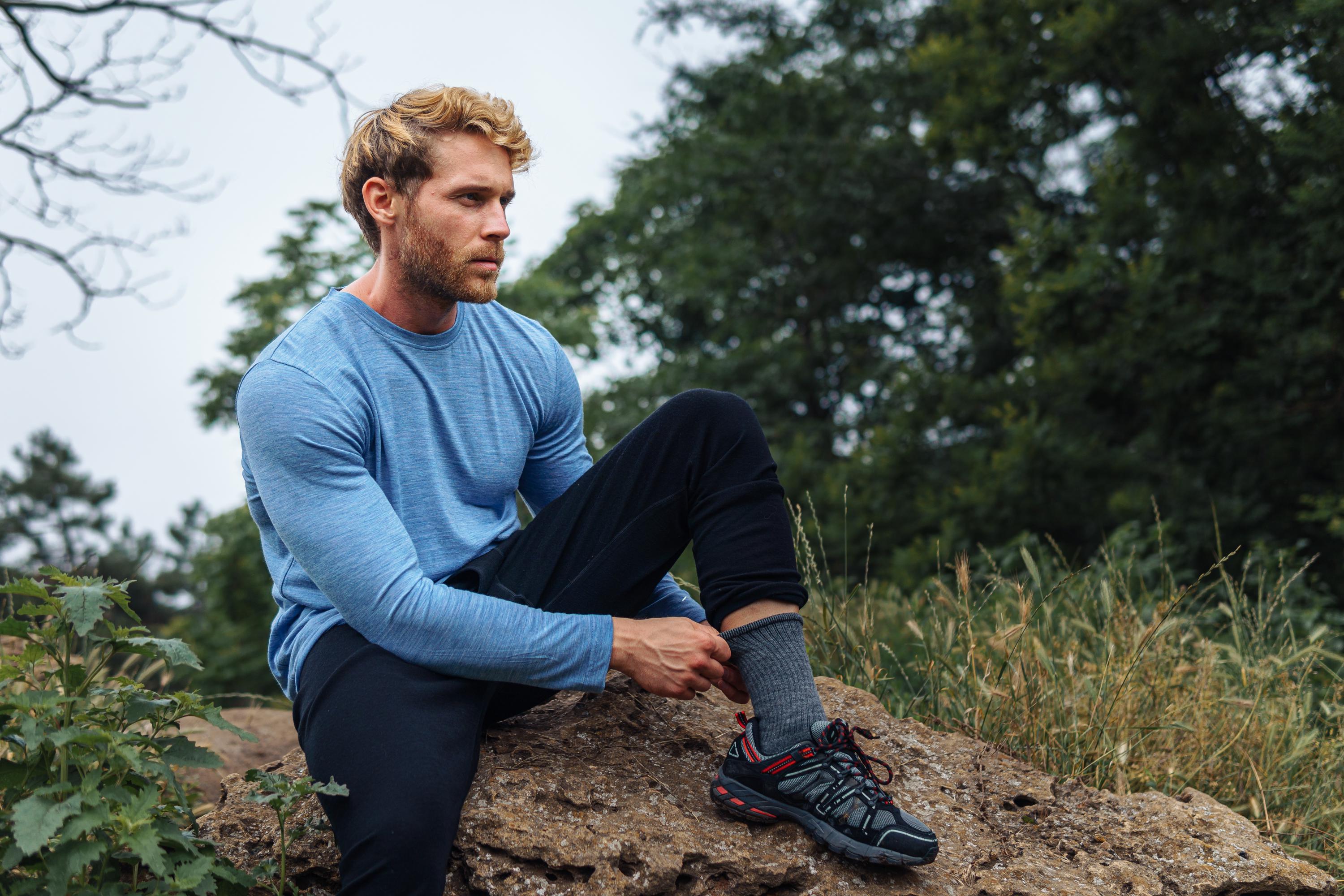 Experience unparalleled comfort with our Hiking Socks, crafted from breathable merino wool as shown in the image's rich texture and crew length design. These moisture-wicking socks are uniquely designed to keep your feet dry and cushioned on every trail, setting them apart from ordinary hiking footwear.