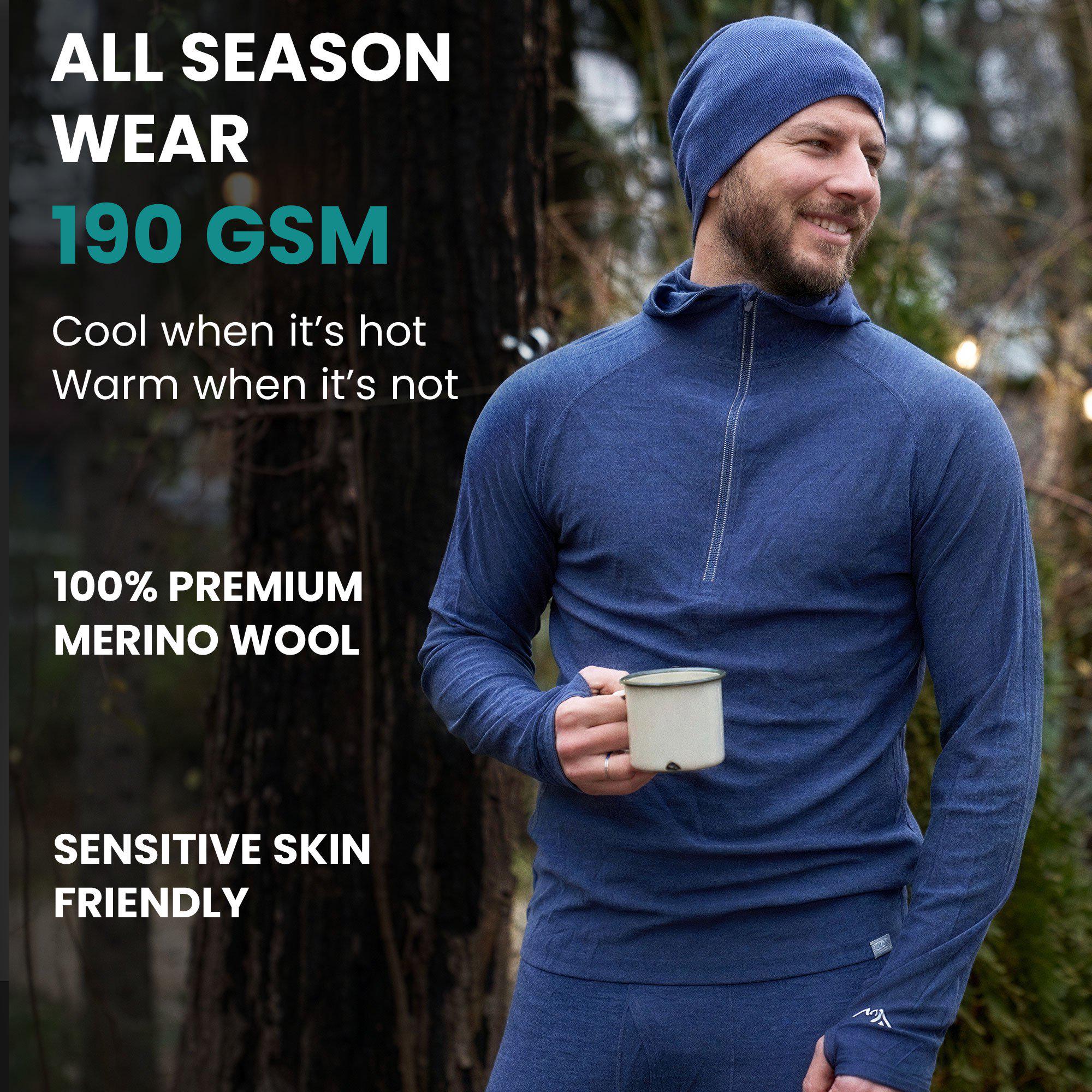 Merino wool, Lightweight 190 g/m² (grams per square meter) - 100% Superfine 19.5 Micron Zip Up Wool Hoodie for Men provides all day comfort and no itch! Designed for daily wear without rubbing, overheating, or bunching of regular cotton. The natural wicking and odor-resistant properties of Merino long sleeve top allow it to absorb moisture better than any other fabric, keeping you dry and fresh.