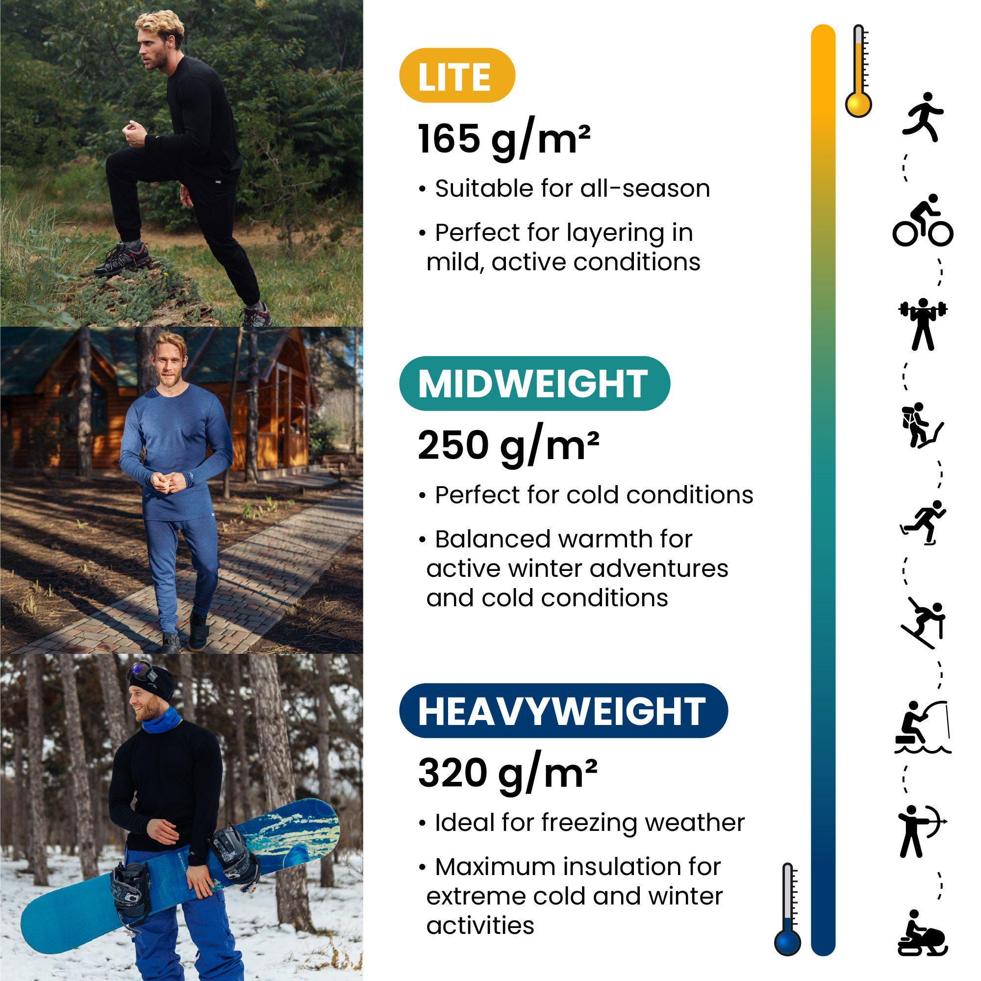 Merino wool, midweight 250 g/m² (grams per square meter) - 100% superfine Merino fabric provides all day comfort and no itch. The natural wicking and odor-resistant properties of Merino long sleeve top allow it to absorb moisture better than any other fabric, keeping you dry and fresh.