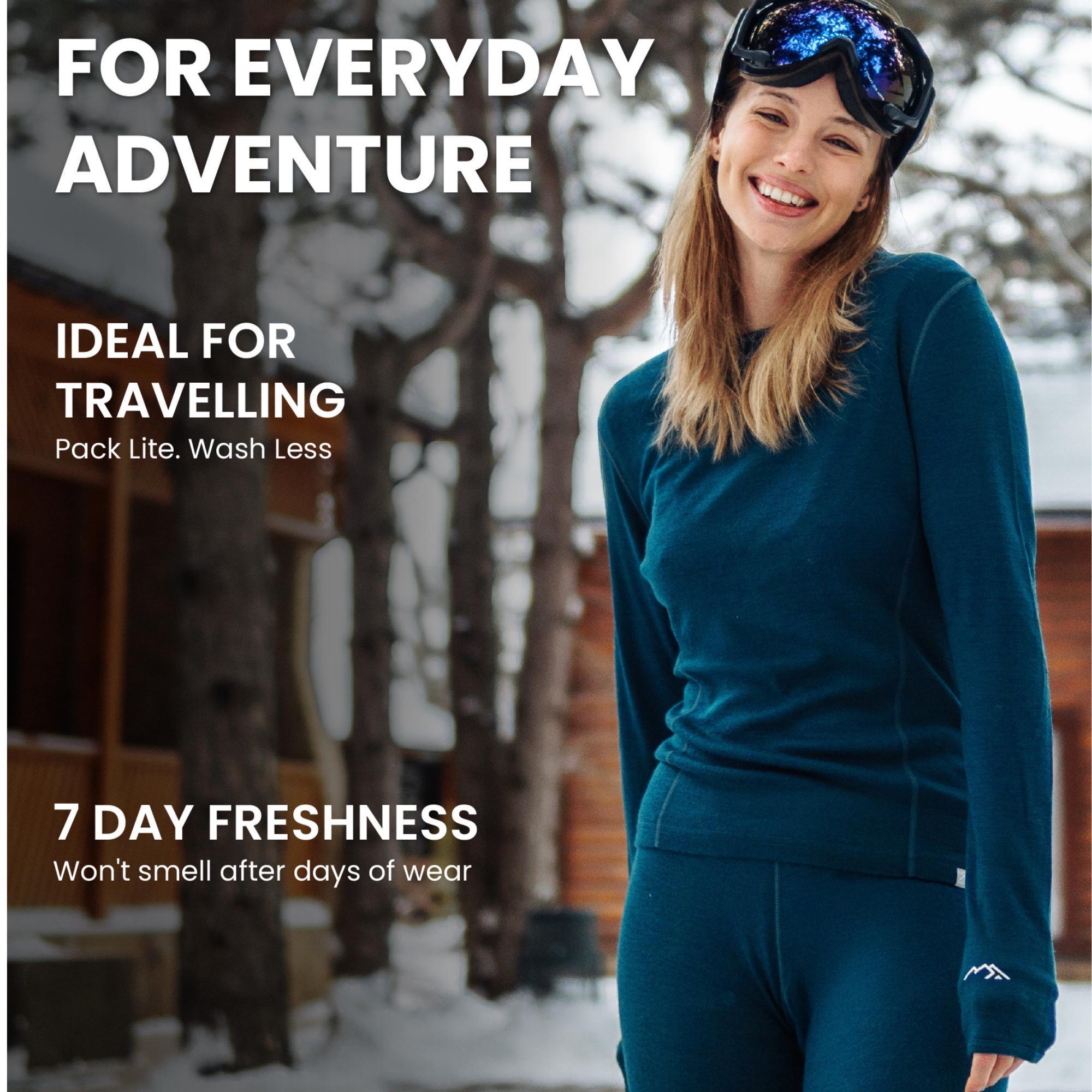 Stay warm and stylish all winter long with our premium merino thermals women base layer merino wool set. Designed for women who love outdoor adventures, active workouts, or cozy days at home, this versatile thermal underwear set is a must-have for chilly weather. Crafted from 100% Merino wool with a dense 320 gsm, it offers exceptional insulation, breathability, and moisture-wicking properties to keep you comfortable no matter the activity.