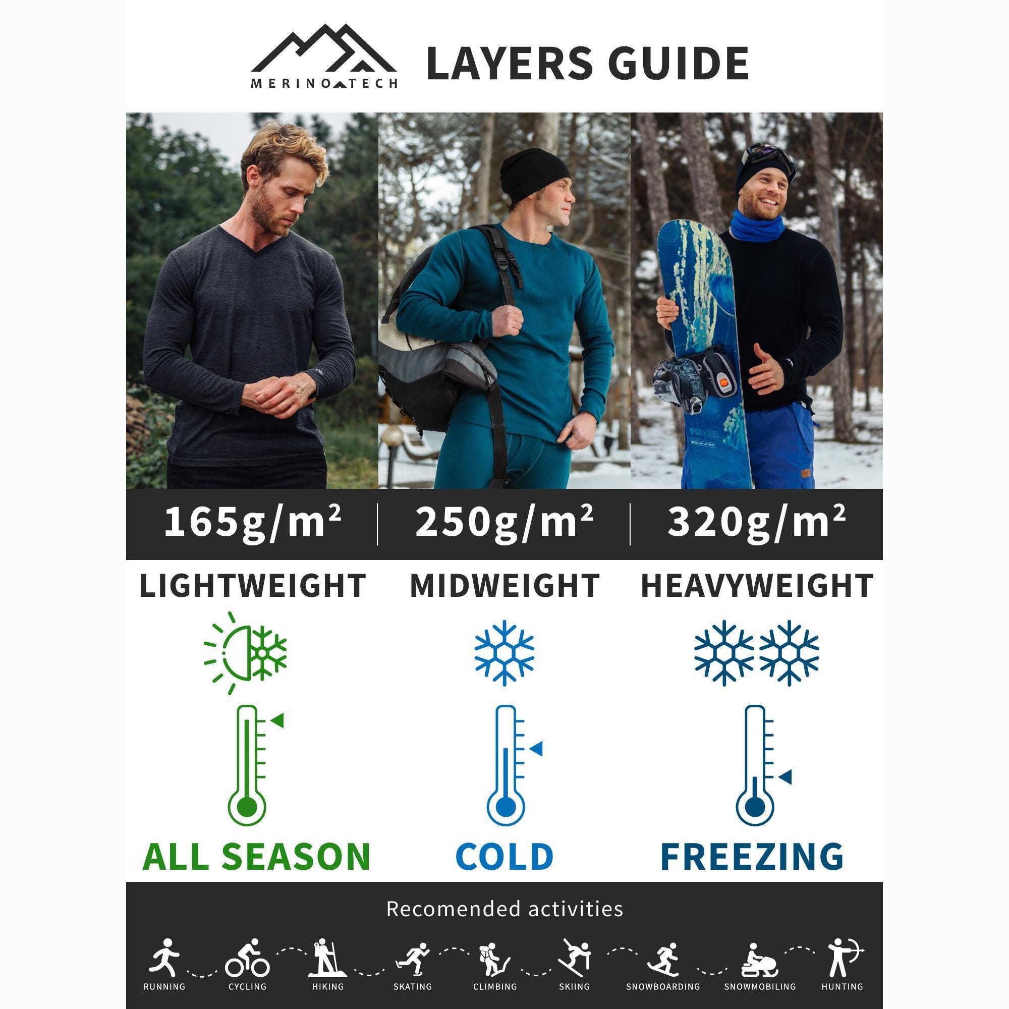 Merino wool, Heavyweight 320 g/m² (grams per square meter) - 100% superfine Merino fabric provides all day comfort and no itch. The natural wicking and odor-resistant properties of Merino long sleeve top allow it to absorb moisture better than any other fabric, keeping you dry and fresh.