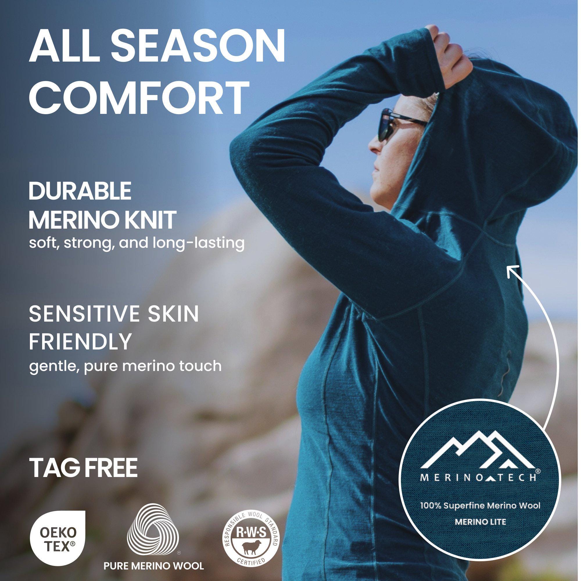 Merino wool, lightweight 190 GSM (grams per square meter) – 100% Superfine 19.5 Micron merino wool base layer provides all day comfort and no itch! merino wool hoodie Women is designed for daily wear without rubbing, overheating, or bunching of regular cotton. Great for 4-season comfort!